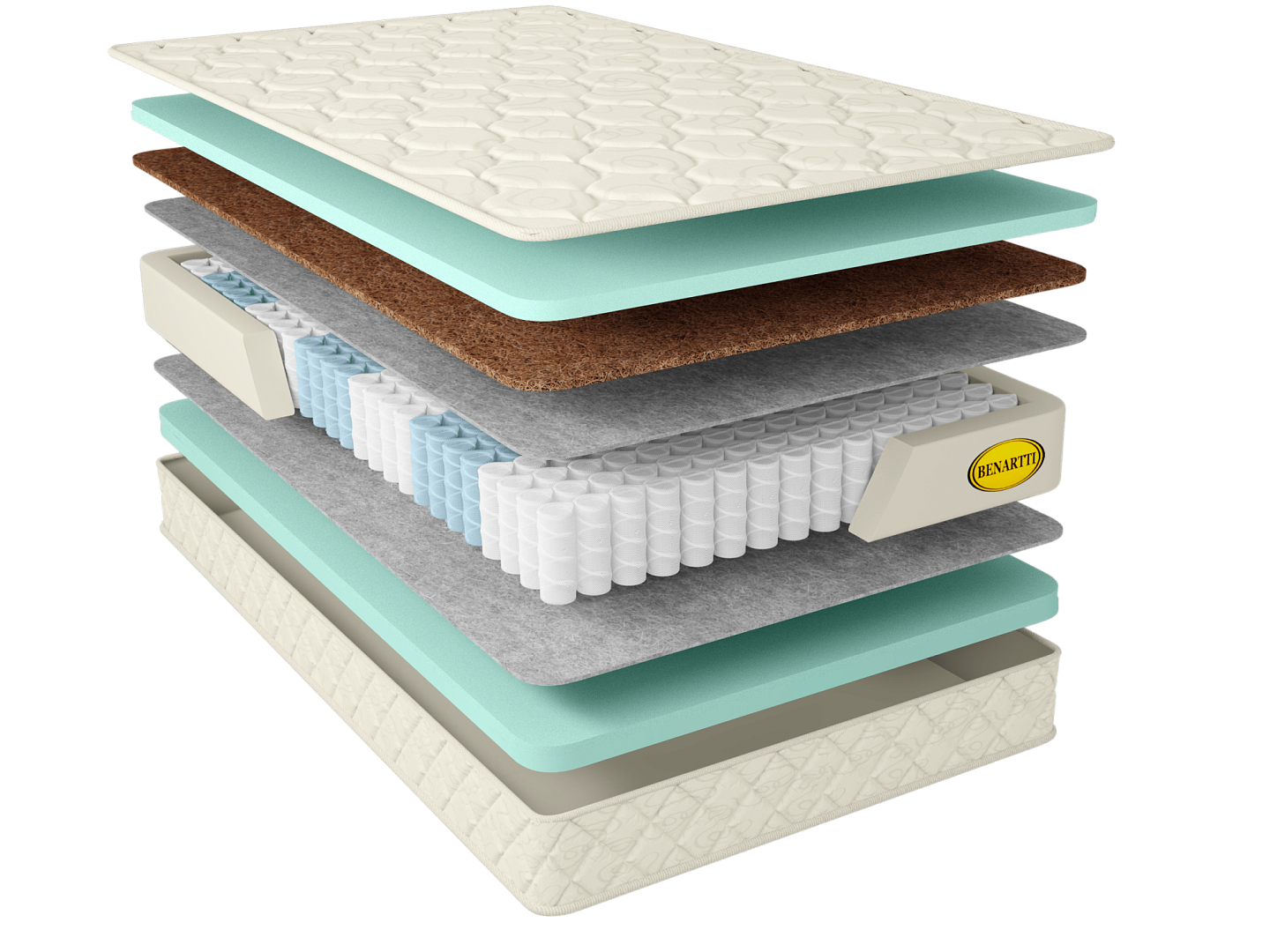 Для дополнительной защиты пружинного блока добавлен изоляционный слой из войлока, разделяющий и защищающий наполнители матраса и пружинный блок. С одной стороны матраса расположен слой кокосовой койры толщиной 1 см, придающий дополнительную жесткость и долговечность матрасу и поверх слой искусственного латекса высотой 3 см, обладающий анатомическим эффектом и износостойкими свойствами. С другой стороны матраса расположен слой искусственного латекса высотой 4 см, обладающий анатомическим эффектом и износостойкими свойствами. Чехол матраса, выполнен из хлопкового жаккарда, простеганного на экологически чистом материале Hollcon. Ткань обработана специальной антибактериальной пропиткой SANITIZED (Швеция). Пропитка обеспечивает полное уничтожение плесневых грибков, не дает развиваться микроорганизмам, пылевым клещам и микробам.