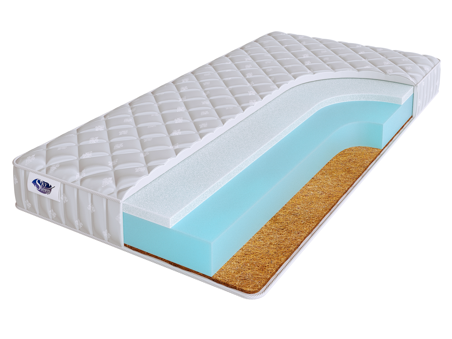 Матрас обладает умеренно-высокой жесткостью сторон. Одна сторона изготовлена из слоя кокосовой койры толщиной 1 см, а вторая из слоя холлофайбера.