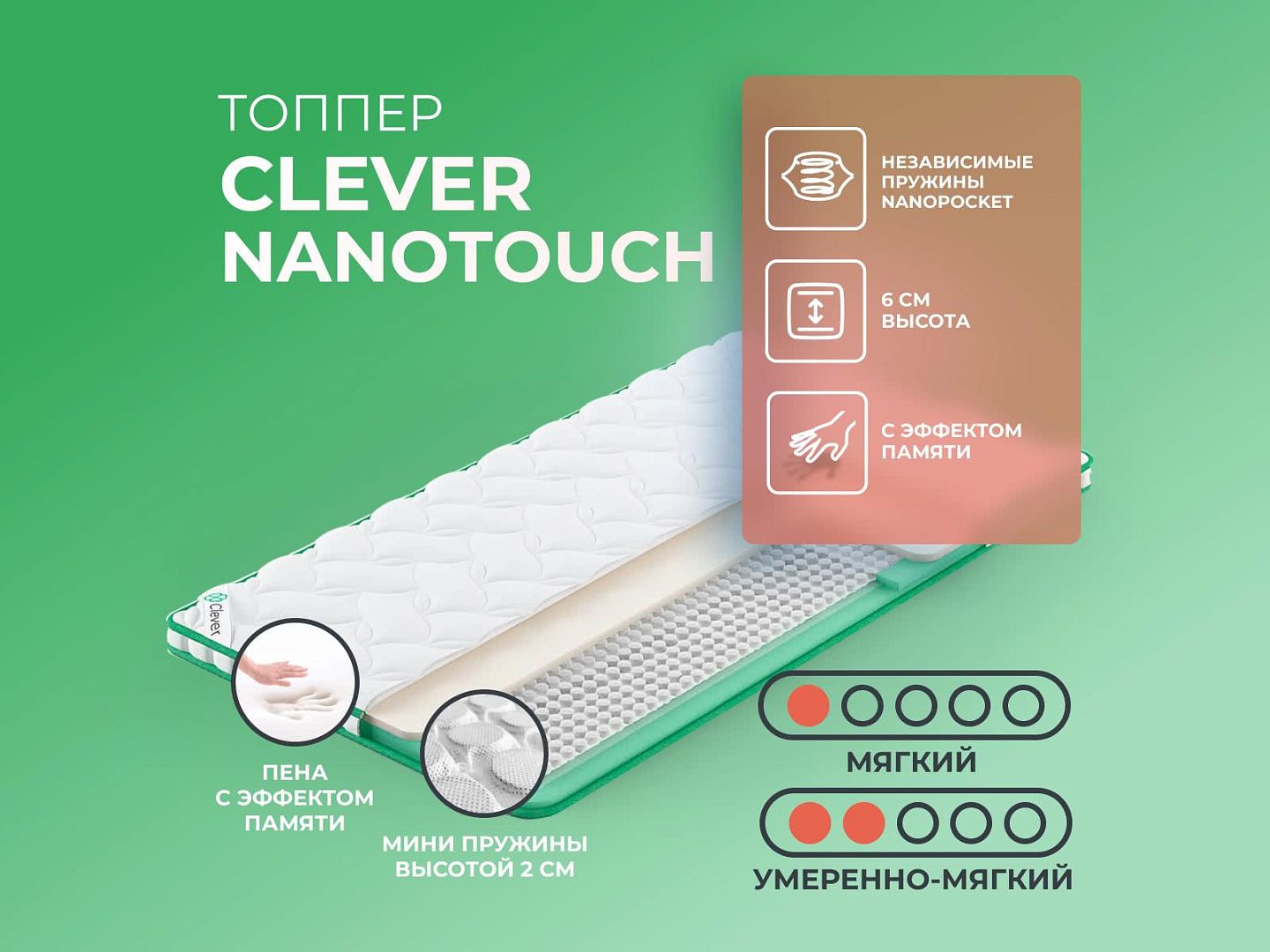 Фабрика Clever получила заслуженную репутацию, благодаря применению новых технологий и безупречному соблюдению стандартов качества. Топпер Clever NanoTouch размером 120х190 — образец продукта с лучшими характеристиками и доступной ценой, матрас создан из дышащих тканей, с эффектом вентиляции.